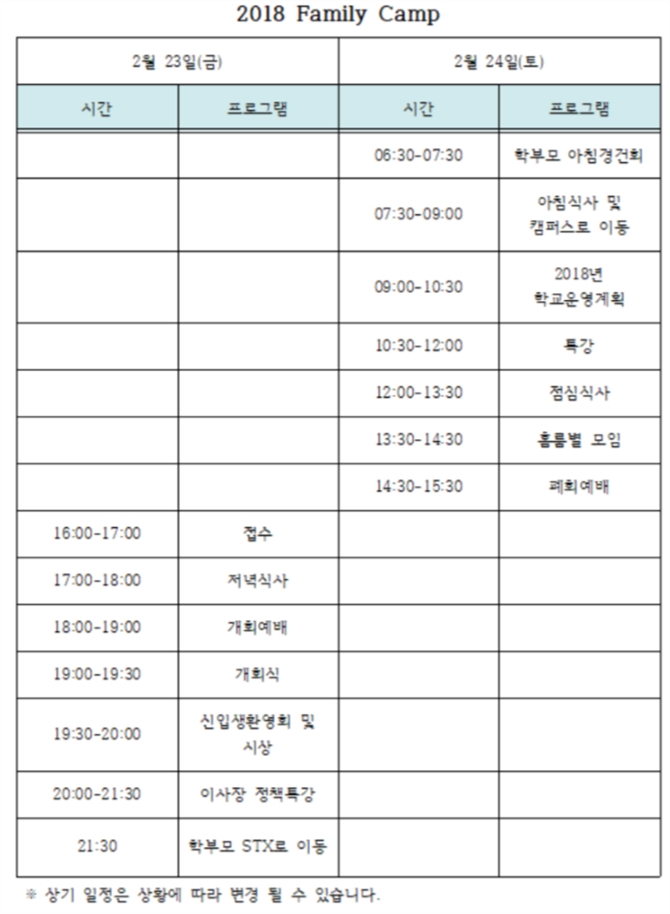■ Family Camp는 수업일수에 포함되는 날입니다. 불참시 결석에 해당하며 18시 이후 도착은 결석으로 처리가 됩니다.